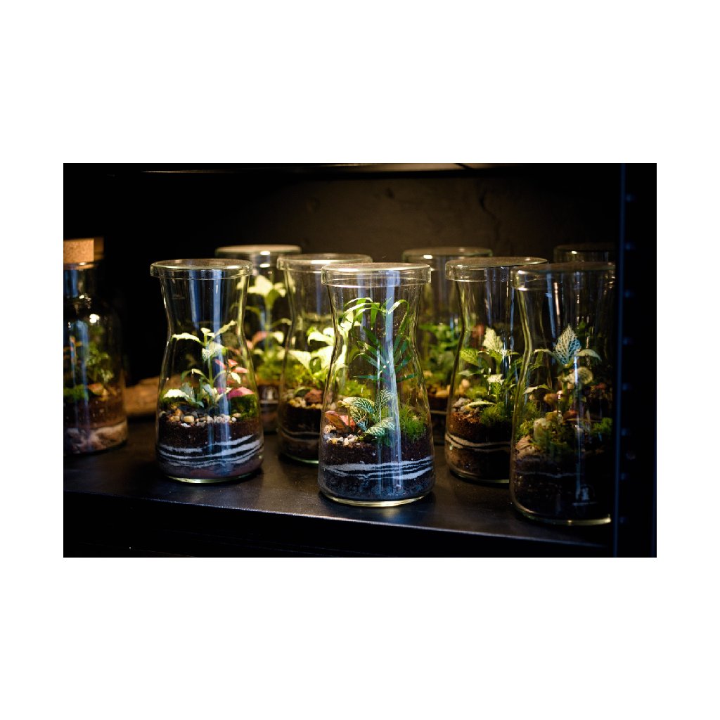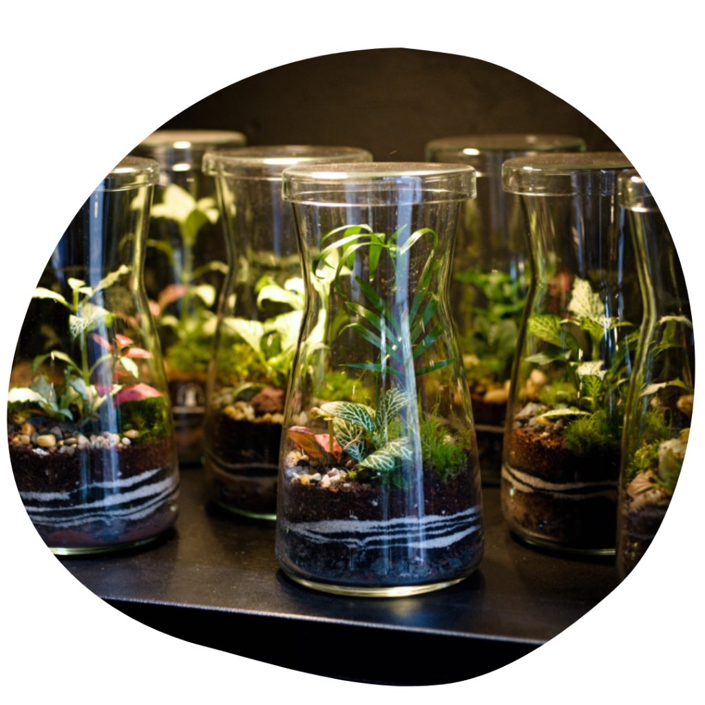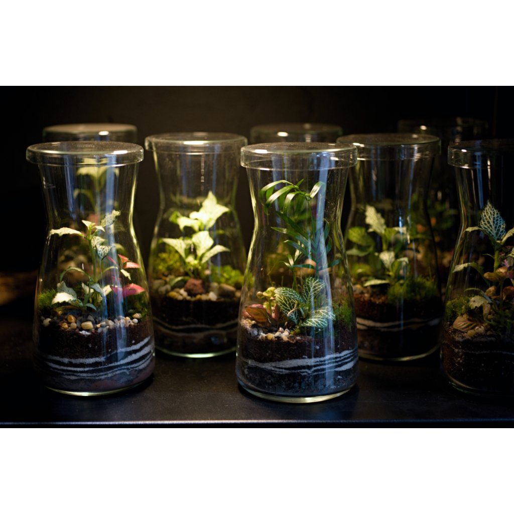 Elegantní skleněná nádoba o velikosti 10x20cm opatřená skleněným víčkem, osázená mechy a vlhkomilnými rostlinkami.