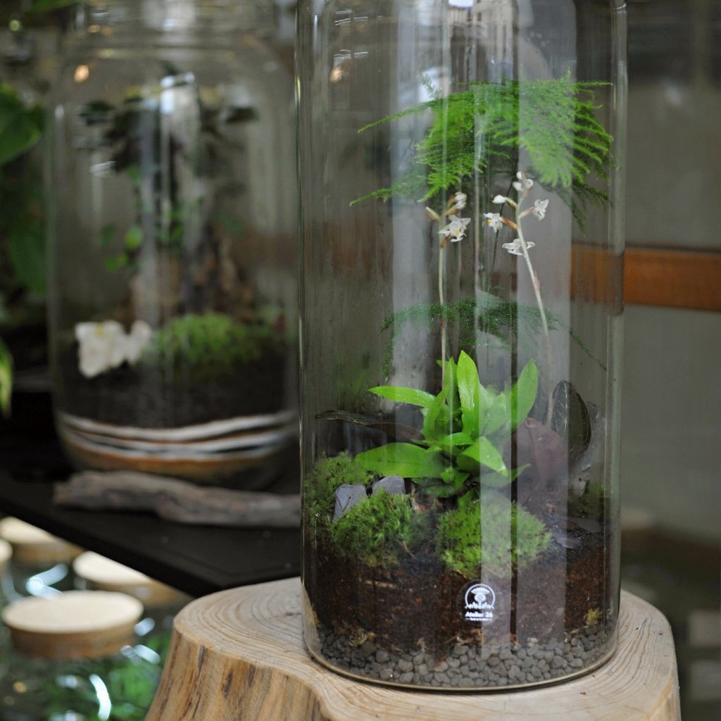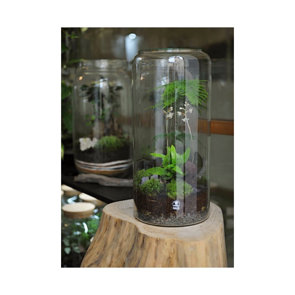Jedinečné vysoké mechárium o velikosti cca 19x40cm se skleněným víčkem. Je to krásný solitér - vynikne zejména ve větším světlem prostoupeném interiéru. Vyžaduje rozptýlené světlo bez přímého slunečního svitu nebo polostín a pokojovou teplotu. Vodu stačí doplit (orosit rozprašovačem) jen cca 2x ročně.