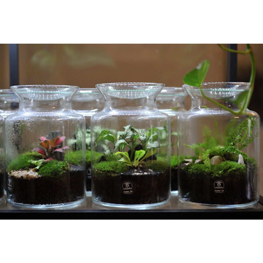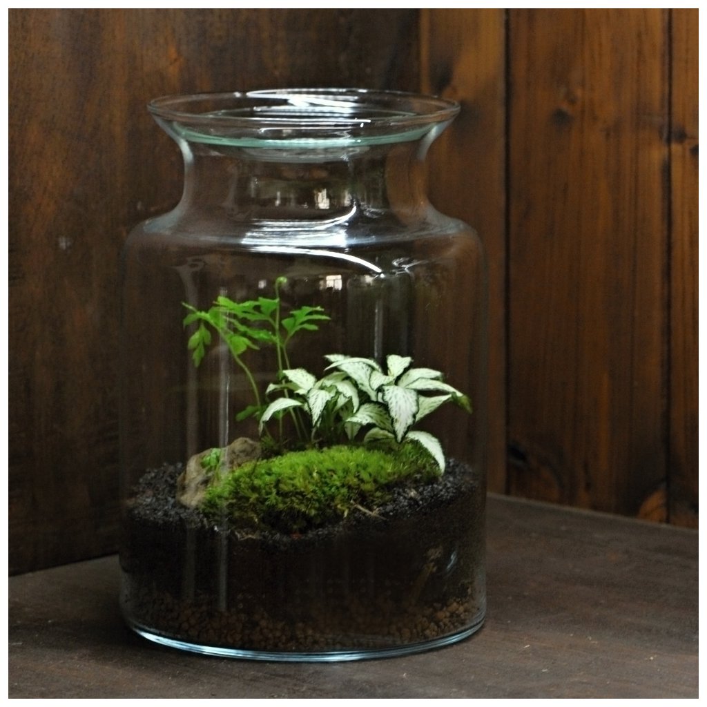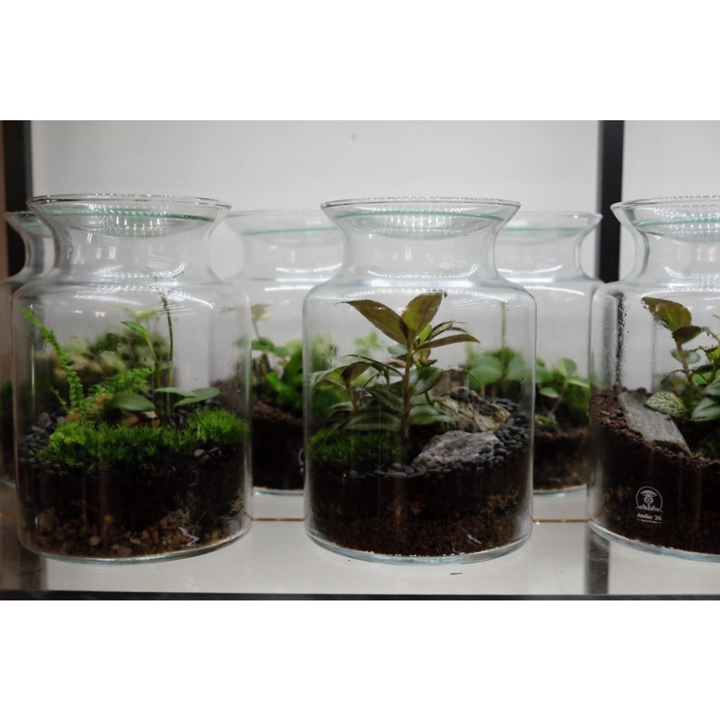 Skleněná nádoba o velikosti 14x20cm, osázená kapradinami a dalšími drobnějšími rostlinkami, uzavřená skleněným víčkem.